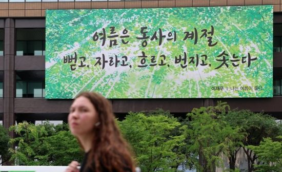9일 서울 광화문 교보생명 외벽에 이재무 시인의 '나는 여름이 좋다'에서 발췌한 광화문 글판이 걸려 있다.