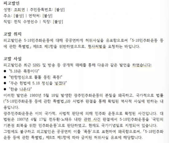 1998년 방콕 아시안게임 여자 수영 금메달리스트인 조희연이 5·18 광주 민주화운동을 폭동이라고 비하했다가 논란이 일자 사과했다.