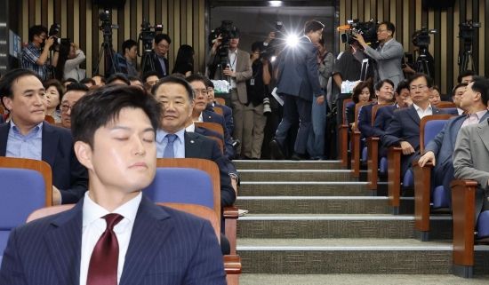 원내대표직 사퇴를 선언한 권성동 국민의힘 원내대표가 9일 국회에서 열린 의원총회에서 김용태 비대위원장의 발언을 끝난 뒤 회의장을 나서고 있다.