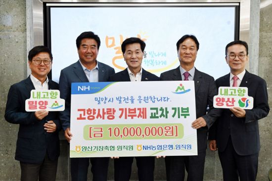 경남 밀양시는 11일 양산시 농·축협 임원 4명이 시청을 방문해 임직원 100여명이 모은 고향사랑기부금 1000만원을 기탁했다고 밝혔다.
