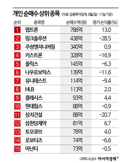 개인은 지난 2일부터 11일까지 펩트론 주식을 786억원어치 사들였다. 평균 매수가격은 16만9700원으로 전날 종가 19만1800원 기준 13% 평가수익률을 기록했다. 개인 순매수 상위 15개사 가운데 평가 수익률이 가장 높다. 펩트론을 제외하고는 코스닥 지수 상승률보다 낮은 평가수익률을 기록하고 있다.