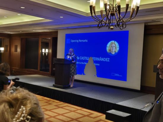 마리아 카스티요 페르난데즈 주한 유럽연합(EU) 대사가 11일 서울 그랜드 인터컨티넨탈 파르나스 호텔에서 열린 ‘녹색 저탄소 기술 코리아 2025’ 비즈니스 네트워킹 리셉션에서 기조연설을 하고 있다. / EU 비즈니스 허브