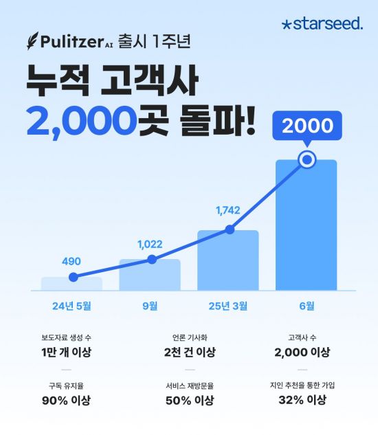 스타씨드(대표 손보미)는 인공지능 기반 글로벌 PR 자동화 플랫폼 '퓰리처 AI' 출시 이후 1년 만에 2000개의 고객사를 확보했다고 12일 밝혔다.