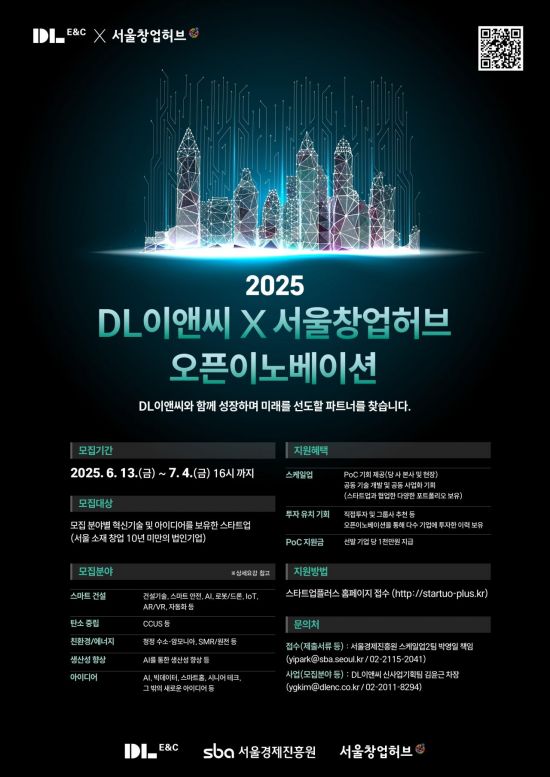 DL이앤씨가 서울시 산하 중소기업 지원기관인 서울경제진흥원과 함께 '오픈 이노베이션 공모전'을 개최한다고 12일 밝혔다. 올해로 5회째를 맞는 이 프로그램은 혁신 기술 및 사업 아이디어를 보유한 스타트업을 발굴하고, 이를 통해 DL이앤씨와의 공동 성장을 도모하는 것이 목적이다.