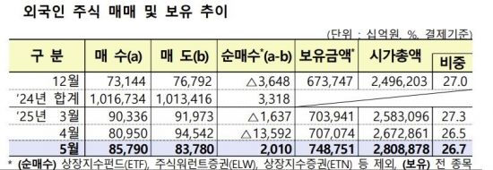 5월 기준 외국인은 국내주식 748조8000억원을 보유하고 있다. 이는 전체 시가총액의 26.7% 수준이다.