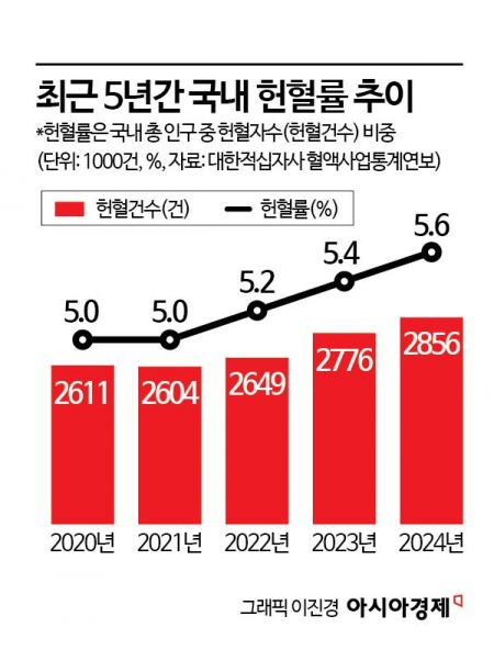 지난해 우리나라 총인구 5121만7000명 가운데 국민헌혈률은 5.6%였다. 앞서 2021년 5.0%, 2022년 5.2%, 2023년 5.4%에 이어 소폭 상승세를 유지했다. 국민헌혈률은 앞서 2015년 6.1%에서 2016년 5.6%로 하락한 이후 줄곧 5%대에 머물러 있다.