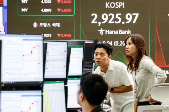코스피가 8거래일 연속 상승세를 이어가고 있는 13일 서울 중구 하나은행 본점 딜링룸에서 딜러들이 업무를 보고 있다.