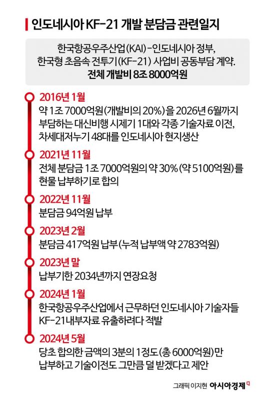 16일 방위사업청에 따르면 인도네시아는 2016년 1월 KF-21 개발비의 20%인 약 1조7000억 원(이후 약 1조6000억 원으로 감액)을 2026년 6월까지 부담하는 대신 관련 기술을 이전받기로 했다.