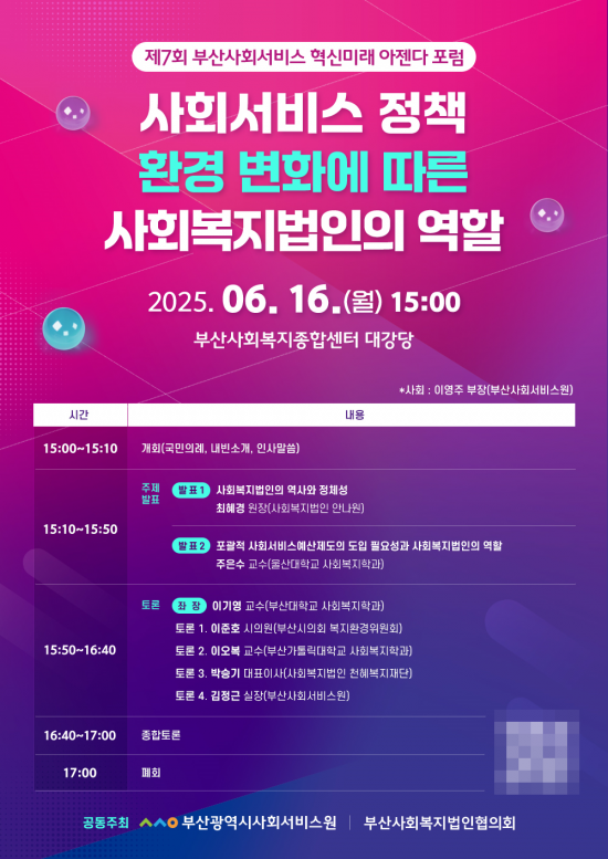 부산사회서비스원과 부산사회복지법인협의회가 오는 16일 오후 3시 부산사회복지종합센터 대강당에서 '제7회 부산사회서비스 혁신미래 아젠다 포럼'을 공동 개최한다.