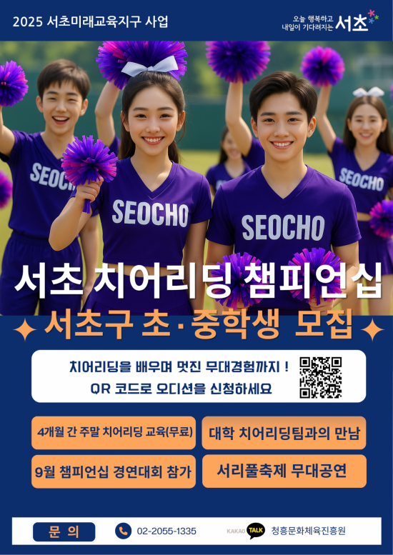 ‘서초 치어리딩 챔피언십’은 트렌디한 치어리딩 활동에 인성교육을 접목해 협동과 배려, 팀워크를 자연스럽게 익히도록 구성됐다. 참가 학생들은 4개월간 주말마다 전문 치어리딩 교육을 받고, 대학 치어리딩팀과의 만남을 통해 진로 탐색의 기회도 갖는다. 9월에는 챔피언십 경연대회가 열리며, 우승팀은 서초구 대표 음악축제 ‘서리풀페스티벌’ 본무대 공연이라는 특별한 기회도 갖게 된다.