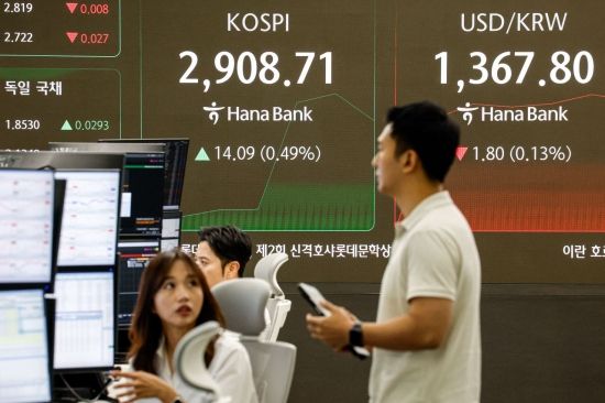 코스피 지수가 전 거래일 대비 8.88포인트 상승한 2903.50에 개장한 16일 서울 중구 하나은행 본점 딜링룸에서 딜러들이 업무를 보고 있다.