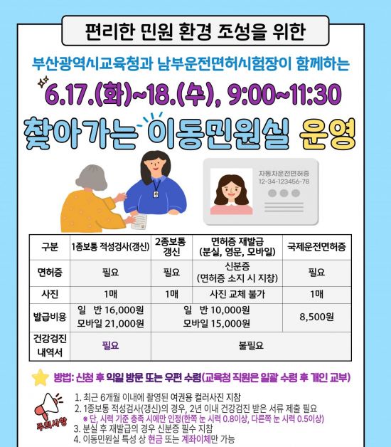 부산교육청은 오는 17일과 18일 이틀간 시교육청 종합민원실에서 오전 9시부터 11시 30분까지 이동민원실을 설치해 시민들의 운전면허 관련 민원을 접수·처리할 예정이다.
