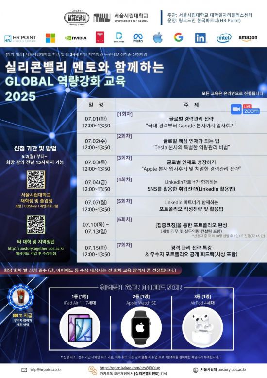 서울시립대학교 대학일자리플러스센터는 다음 달 1일부터 15일까지 2주간 '실리콘밸리 멘토와 함께하는 Global 역량강화 교육'을 운영한다고 17일 밝혔다.