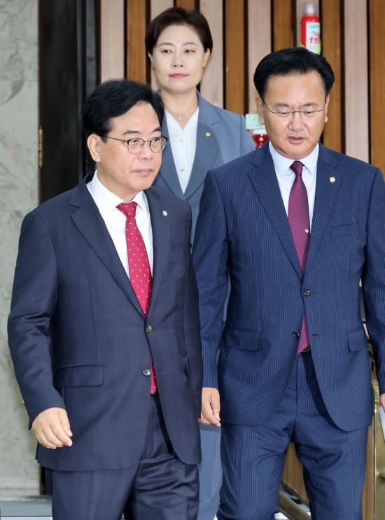 송언석 국민의힘 원내대표가 17일 국회에서 열린 원내대책회의에 참석하고 있다.