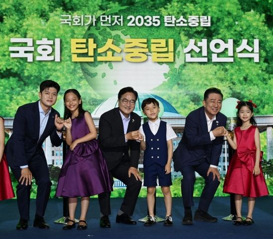우원식 국회의장과 김병기 더불어민주당 대표 직무대행 겸 원내대표, 김용태 국민의힘 비상대책위원장 등이 17일 국회에서 열린 탄소 중립 선언식에서 탄소중립 비전 퍼포먼스를 하고 있다.