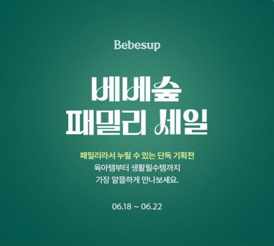 '베베숲 패밀리 세일'은 패밀리 멤버십 오픈에 이어 멤버 대상 전용 혜택을 담은 행사로, 패밀리 멤버십 회원 맞춤 혜택이 제공된다. 비회원일 경우에는 간편 가입 후 혜택을 받을 수 있다. 특히 베베숲 인기 제품이 최대 54% 할인가로 제공되며, 쿠폰, 이벤트 선물 증정 등 패밀리 멤버십 고객만이 누릴 수 있는 풍성한 혜택이 준비되어 있다.