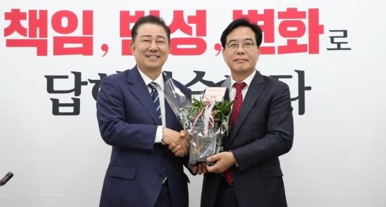 김병기 더불어민주당 대표 직무대행 겸 원내대표(왼쪽)가 17일 국회에서 송언석 국민의힘 원내대표를 예방, 축하난을 전달하고 있다.