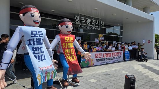 광주시민단체협의회 등 지역 10개 단체로 구성된 '2025 차별철폐 광주대행진 추진단'은 18일 오전 광주시청 앞에서 기자회견을 열고 "헌법은 '모든 국민은 법 앞에 평등하다'고 했는데, 현실은 왜 차별투성이냐"라며 이같이 밝혔다.