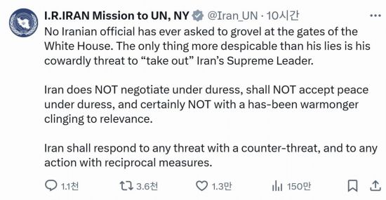 이란 대표부는 또 "이란은 모든 위협에 맞대응할 것이며, 모든 행동에 상응하는 조치를 취할 것"이라고 덧붙였다.