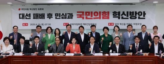 김용태 비상대책위원장(앞줄 왼쪽 세번째) 비롯한 국민의힘 의원들이 19일 국회 의원회관에서 당의 혁신을 바라는 의원모임 주최로 열린 '대선 패배 후 민심과 국민의힘 혁신방안' 토론회에서 기념 촬영을 하고 있다.
