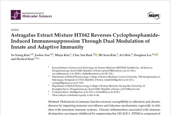 이번 연구는 HT042의 면역 기능 개선 가능성을 과학적으로 입증한 것으로, 현재 인체적용시험도 진행 중이다. 업계에선 HT042가 천연물 기반 면역 보조제로서 성장기 청소년뿐 아니라 고령자, 암 환자, 만성질환자에게도 활용 가능성이 크다고 기대하고 있다.