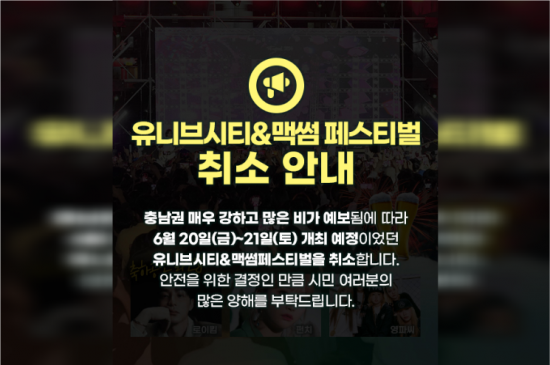 충남 천안시는 20일 저녁부터 21일까지 천안종합운동장 오륜문광장 일대에서 열릴 예정이었던 '2025 천안 유니브시티 with 맥썸 페스티벌'을 전면 취소했다고 19일 밝혔다.