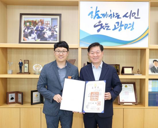 지난달 적극행정 유공 정부포상에서 근정포장을 받은 이현우 광명시 주무관(왼쪽)이 박승원 광명시장과 기념촬영을 하고 있다. 시는 이 주무관의 적극행정 공로를 인정해 19일 특별승진을 결정했다. 광명시 제공