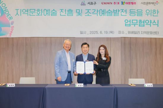 서울 서초구가 19일 지역 문화예술 진흥과 조각예술·공공미술 발전을 위해 크라운해태제과, 서초문화재단과 업무협약을 맺었다.