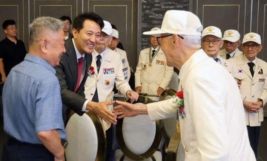 오세훈 서울시장이 20일 서울 마포구 터틀케이에서 열린 '6.25 참전유공자회 서울지부 위로연'에 참석, 유공자들과 인사를 나누고 있다.