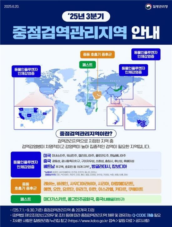 3분기 중점검역관리지역에는 페스트 감염 위험이 큰 마다가스카르 등 3개국, 동물인플루엔자 인체감염증 위험이 큰 미국 미네소타주와 중국 광둥성, 베트남 남동부 권역 등 5개 국가의 다수 지역, 중동호흡기증후군(MERS·메르스) 위험이 큰 레바논 등 13개국이 지정됐다. 지난 분기와 비교하면 동물인플루엔자 인체감염증 관리지역이었던 미국 미시간주가 빠졌고 베트남 남동부·메콩삼각주 권역과 방글라데시가 추가됐다.
