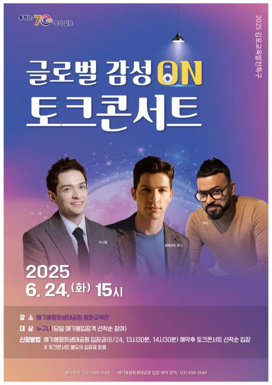 경기 김포시는 오는 24일 애기봉평화생태공원 평화교육관에서 '2025 김포교육발전특구 글로벌 감성ON 토크콘서트'를 개최한다고 21일 밝혔다.