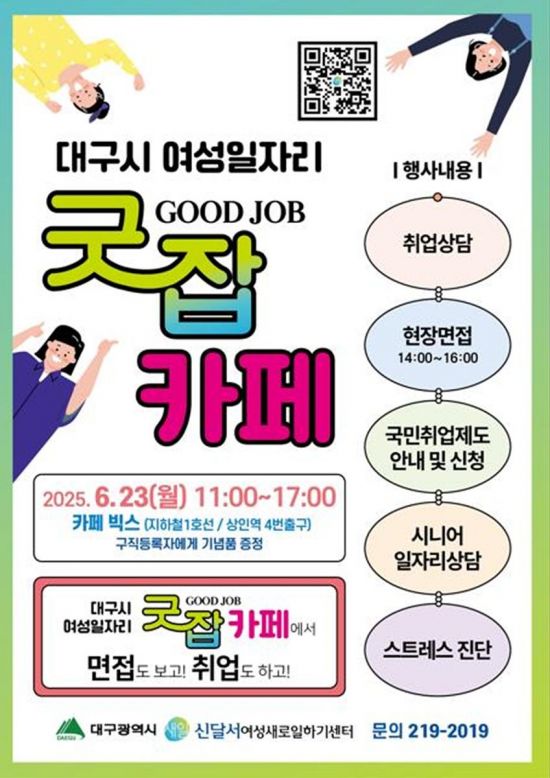 대구시는 취업을 희망하는 경력단절 및 미취업 여성을 위해 '찾아가는 여성일자리 '굿잡(Good Job)' 카페' 행사를 오는 23일 오전 11시부터 카페 빅스(도시철도 1호선, 상인역 4번출구)에서 운영한다.