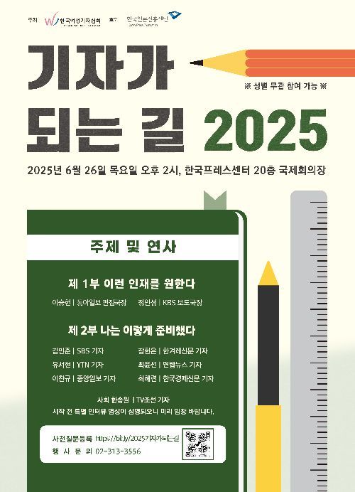 한국여성기자협회는 한국언론진흥재단의 후원으로 오는 26일 오후 2시 서울 중구 한국프레스센터 20층 국제회의장에서 '2025 기자가 되는 길' 워크숍을 개최한다.