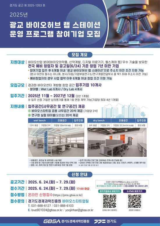 경기도와 경기도경제과학진흥원이 도내 바이오스타트업 생태계 활성화 및 광교 바이오 클러스터 육성을 위해 '2025년 광교 바이오허브 랩 스테이션 운영 프로그램' 참여기업을 이달 24일부터 다음 달 29일까지 모집한다.