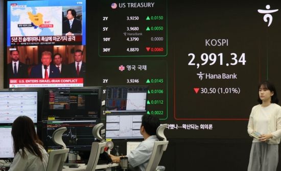 미국의 이란 공습에 따라 중동불안이 커지고 있는 가운데 코스피 지수가 장중 3000선이 무너진 23일 서울 중구 하나은행 딜링룸 현황판에 이란 관련 뉴스가 나오고 있다. 이날 코스피 지수는 전 거래일 대비 0.98% 내린 2,992. 83포인트(0.24%) 장을 시작했다.