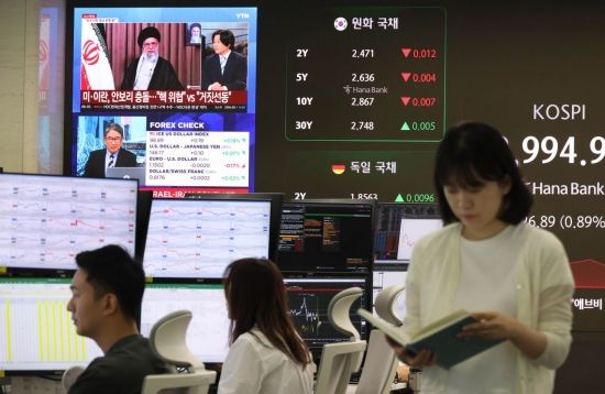미국의 이란 공습에 따라 중동불안이 커지고 있는 가운데 코스피 지수가 장중 3000선이 무너진 23일 서울 중구 하나은행 딜링룸 현황판에 이란 관련 뉴스가 나오고 있다. 이날 코스피 지수는 전 거래일 대비 0.98% 내린 2,992. 83포인트(0.24%) 장을 시작했다.