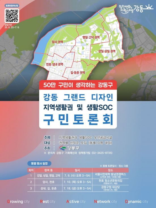 참석 주민들은 자신이 직접 거주하는 지역의 현안과 발전 방향에 대해 자유롭게 제안하고 토론에 참여할 수 있다. 토론회 참가자 모집은 오는 23일부터 7월 6일까지 진행되며, 동별 10명 내외 약 220명을 선착순 모집한다. 참가 신청은 온라인 사전 신청(네이버 폼 및 QR코드) 및 추천으로 진행하며, 자세한 사항은 강동구 누리집(홈페이지) ‘강동소식’에서 확인할 수 있다.