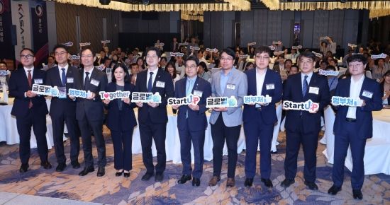 김성섭 중소벤처기업부 차관(오른쪽 다섯번째)을 비롯한 범부처 관계자들이 24일 서울 종로 포시즌스호텔에서 열린 범부처 스타트업 해외진출 출범식에서 퍼포먼스를 하고 있다.