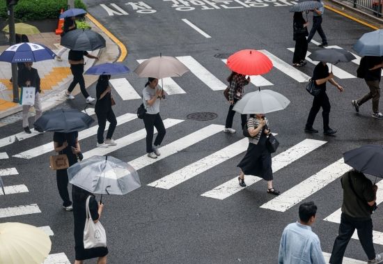 전국 대부분 지역에서 장맛비가 이어지고 있는 25일 서울 중구 서울시청 인근에서 직장인들이 우산을 쓰고 출근길에 오르고 있다.