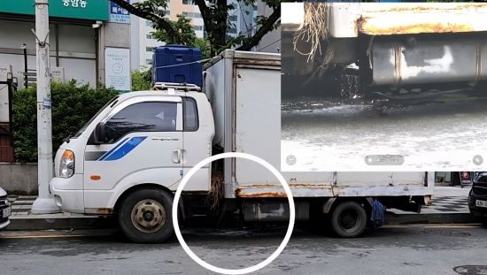해당 차량은 광주 서구의 한 '먹자골목'으로 불리는 상가밀집 지역에 부식된 채 주차돼 있었다. 본지 취재진은 차량 하부에서 지속해서 떨어지는 액체를 수상히 여겨 현장을 촬영했고, 대기 중 화물칸 문이 열리는 순간, 내부에서 한 남성이 주방용품을 세척하는 장면을 직접 확인했다.