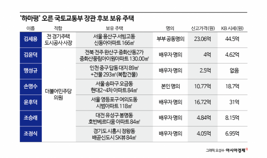 27일 정치권과 부동산 업계에 따르면 김윤덕·맹성규·손명수·윤후덕·조승래·조정식 더불어민주당 의원과 김세용 고려대 교수(전 경기주택도시공사 사장), 방윤석 대전국토관리청장 등이 국토부 장관 하마평에 거론되는 인물들이다. 이 가운데 방 청장을 제외한 7명은 모두 고위 공직자 재산공개를 통해 주택 보유내역이 확인된다. 방 청장은 나등급 고위공무원으로 재산공개 대상이 아니다.