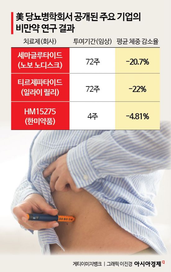 후발 주자들의 추격도 거세다. 특히 한미약품은 이번 ADA에서 처음으로 삼중작용제 HM15275와 근육 증가 후보물질 HM17321의 데이터를 공개했다. HM15275는 GLP-1, GIP, 글루카곤 수용체를 동시에 표적하는 삼중 작용제다. 기존 GLP-1 단일 제제보다 우수한 감량 효과와 상대적으로 낮은 제지방 손실이 특징이다. 회사는 연내 2상 진입을 목표로 하고 있으며, 고도비만 환자 대상 글로벌 개발 전략도 검토 중이다. HM17321은 지방을 선택적으로 감소시키면서 근육량은 오히려 증가시키는 기전으로, 위고비 수준의 감량 효과를 보이면서 근육 기능까지 개선한 전임상 데이터를 공개했다.