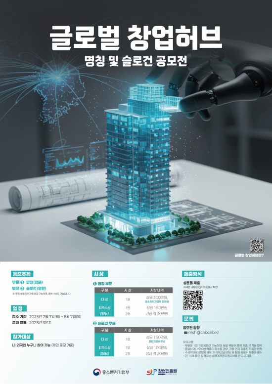 이번에 공모하는 사항은 글로벌 창업허브의 명칭과 캐치프레이즈다. 공모는 오는 7월 7일부터 8월 7일까지 한 달간 진행되며 국적에 관계없이 누구나 참여할 수 있다. 명칭과 캐치프레이즈는 영문(English)으로 제출해야 하며, 창의성과 상징성 등을 평가해 대표작을 선정할 계획이다.