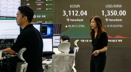 코스피 지수가 개장 직후 4거래일 만에 3100선을 회복한 1일 서울 중구 하나은행 본점 딜링룸에서 딜러들이 업무를 보고 있다.