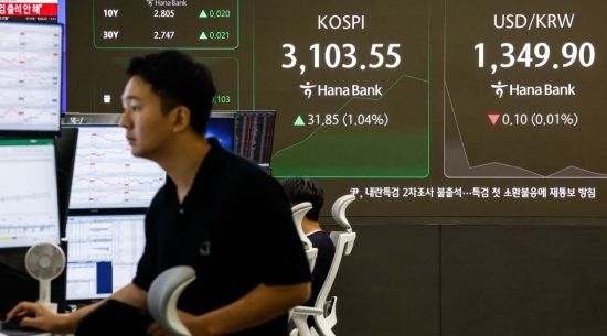 코스피 지수가 개장 직후 4거래일 만에 3100선을 회복한 1일 서울 중구 하나은행 본점 딜링룸에서 딜러들이 업무를 보고 있다.