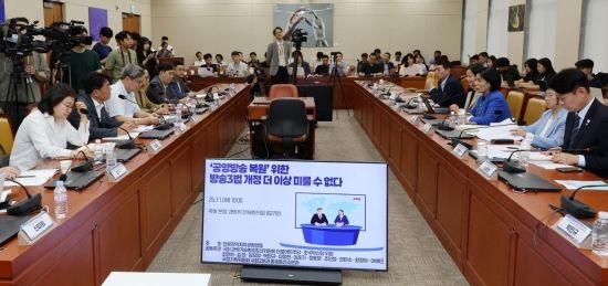 최민희 국회 과방위원장이 1일 국회에서 열린 '공영방송 복원 위한 방송3법 개정, 더 이상 미룰 수 없다' 긴급토론회에서 인사말을 하고 있다.