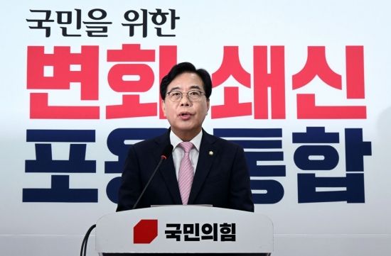 송언석 국민의힘 비상대책위원장 겸 원내대표가 2일 국회에서 비상대책위원장 취임 기자회견을 하고 있다.