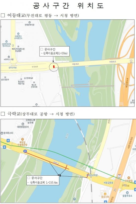 이번 공사는 교량구조 안정성과 통행 안전을 확보하기 위해 추진하는 것으로, 앞서 중차량 통행에 따른 반복 하중으로 신축이음장치 기능이 저하됨에 따라 소음·진동과 구조물 손상 등이 우려된 바 있다.