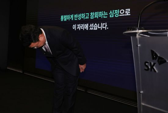 유영상 SK텔레콤 대표는 4일 해킹 사태 관련해 "사이버 침해 사고와 관련해 통렬하게 반성하고 참회하는 심정으로 이 자리에 섰다"며 "SK텔레콤의 모든 임직원은 고객 여러분께 다시 한번 진심으로 사과드린다"고 고개를 숙였다.