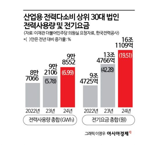 7일 이재관 더불어민주당 의원실이 한전에서 제출받은 '2022~2024년 전력요금 부담 현황'에 따르면 전력 사용량 상위 30대 법인의 전기요금 총액은 2022년 9조4725억원에서 올해 16조1109억원으로 70%가량 급증했다. 같은 기간 전력 사용량은 8만7066GWh에서 9만8552GWh로 13.2% 증가하는 데 그쳤다.